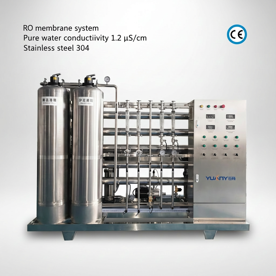PLC, Raw water pump, Quartz sand filter, High pressure pump, Reverse osmosis membrane, Electric automatic control panel, Pressure Gauge, Flowmeter, Conductivity meterComposants de base