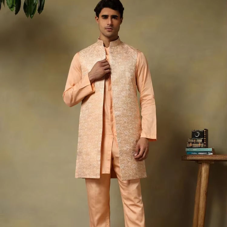 CHAAP Men's Vintage Pearl Peach Dola Silk Kurta Set with Brocade Jacket for Parties Weddings Diwalis Beaches