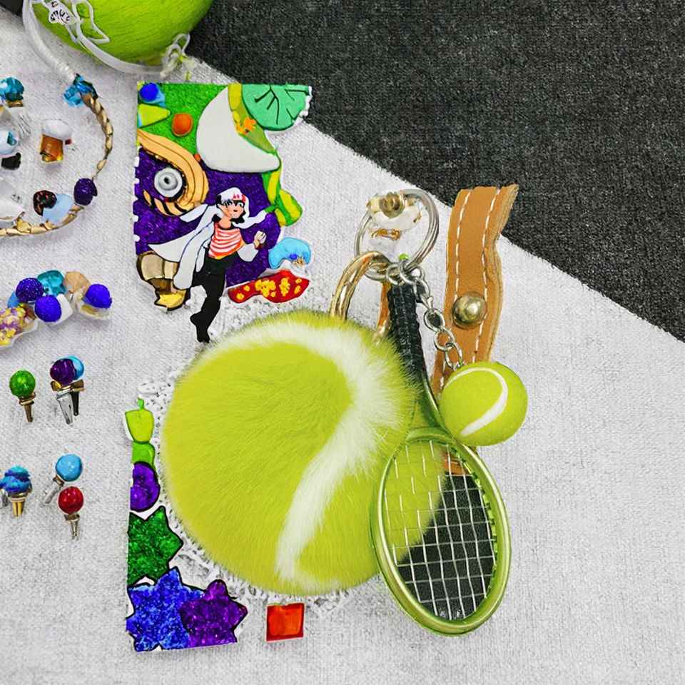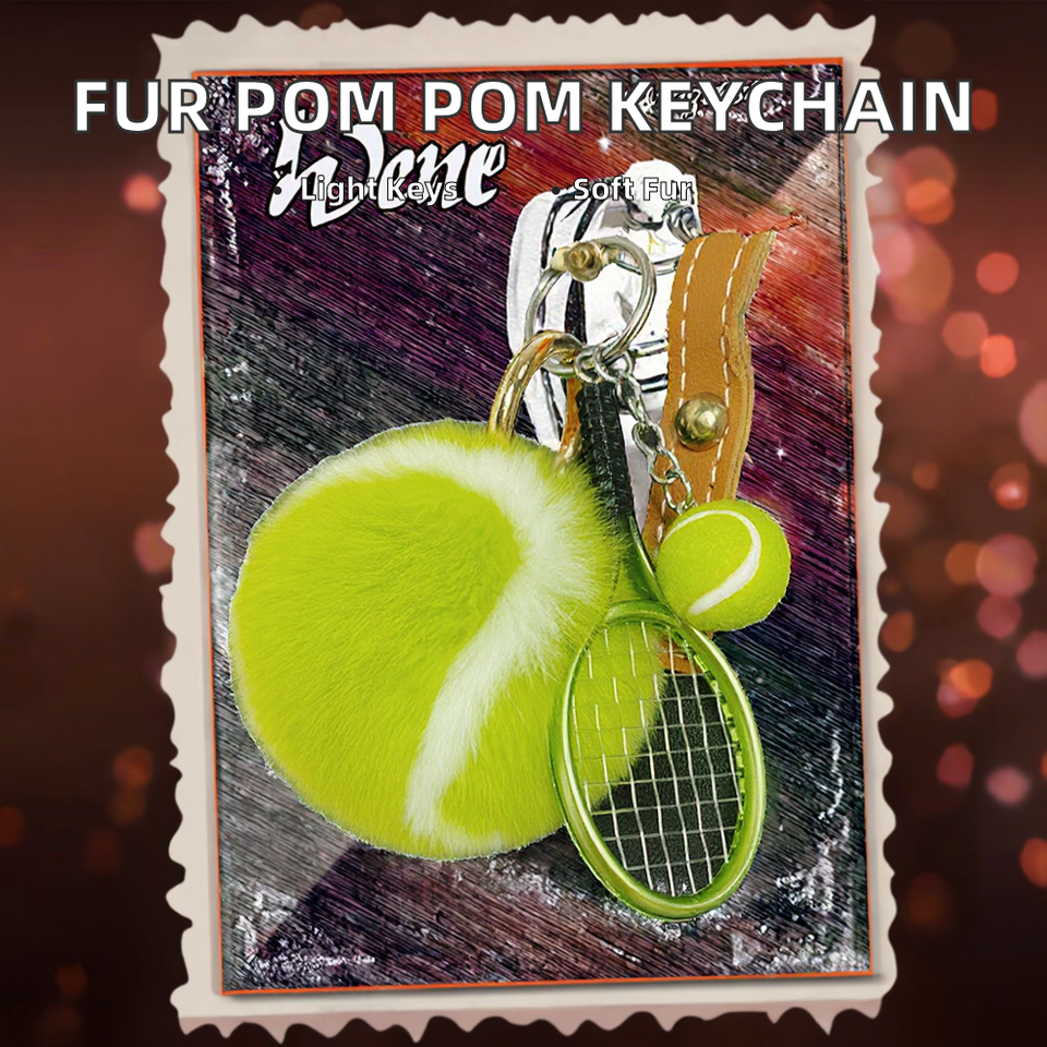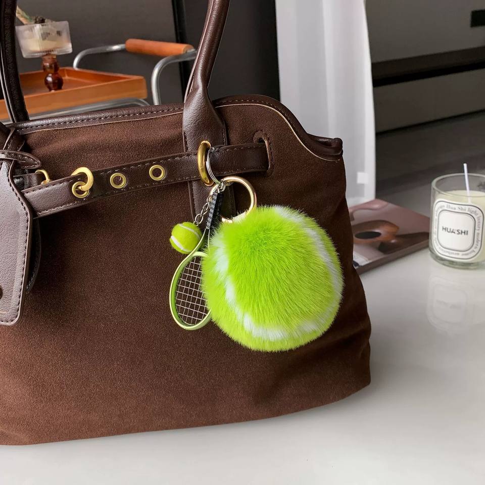CHENXI Porte-clés pompon en vraie fourrure de lapin Rex, petit sac de tennis, pendentif de voiture avec boule en peluche métallique, cadeau