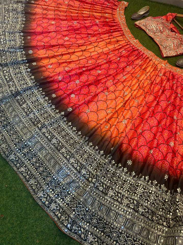 CHINON SILK WITH DIGITAL PRINT AND EMBROIDERY SEQUENCE DESIGN WORK Design Wedding Lehenga Choli Wholesalers Surat India