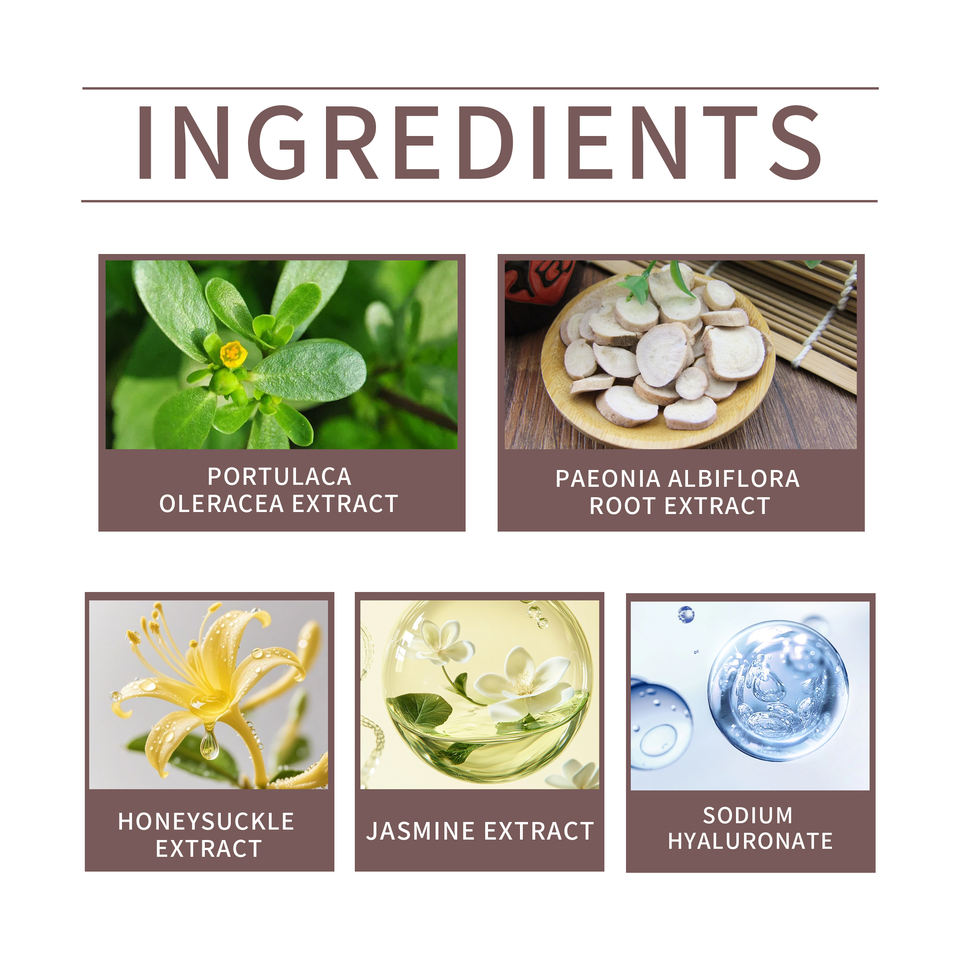 Extrait de Portulaca Oleracea, Extrait de racine de Paeonia Albiflora, Extrait de chèvrefeuille, Extrait de jasmin, Hyaluronate de sodium