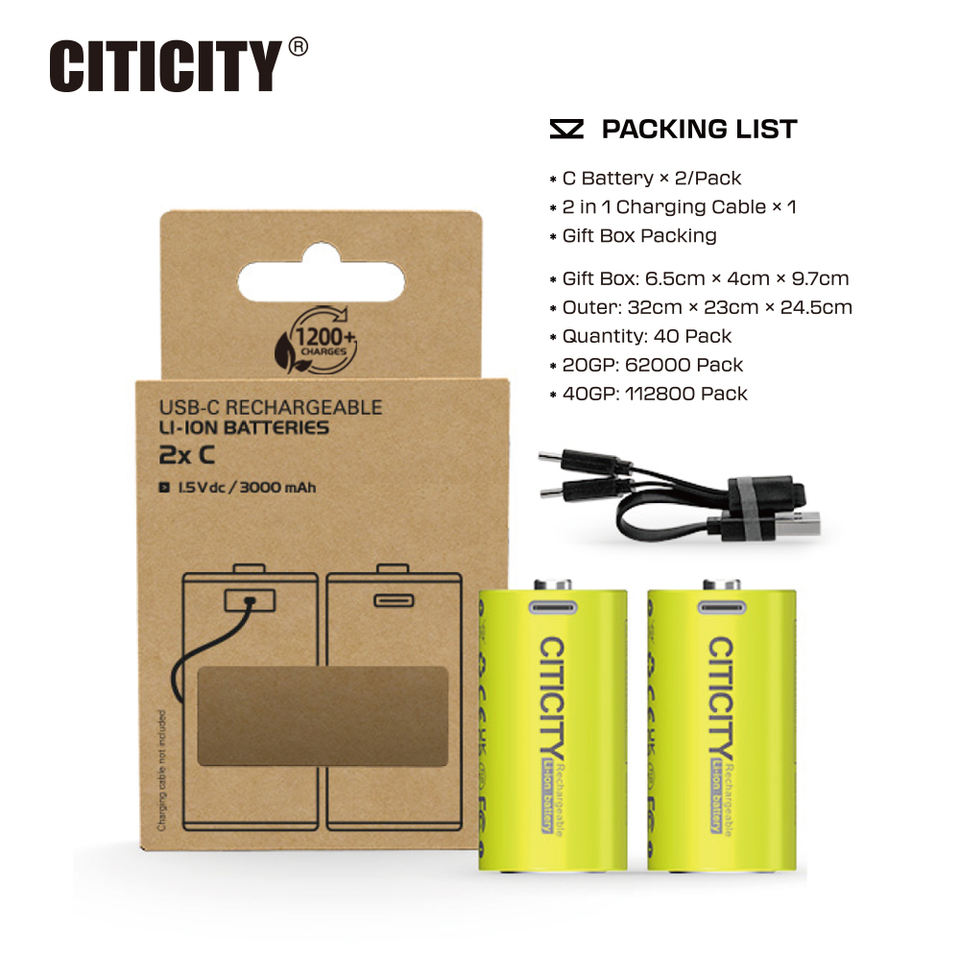 CITICITY Piles rechargeables C avec chargeur USB, Lithium-ion 1,5 V 3000 mAh, s'endentonnent en moins de 3,5 heures, plus de 1200 cycles