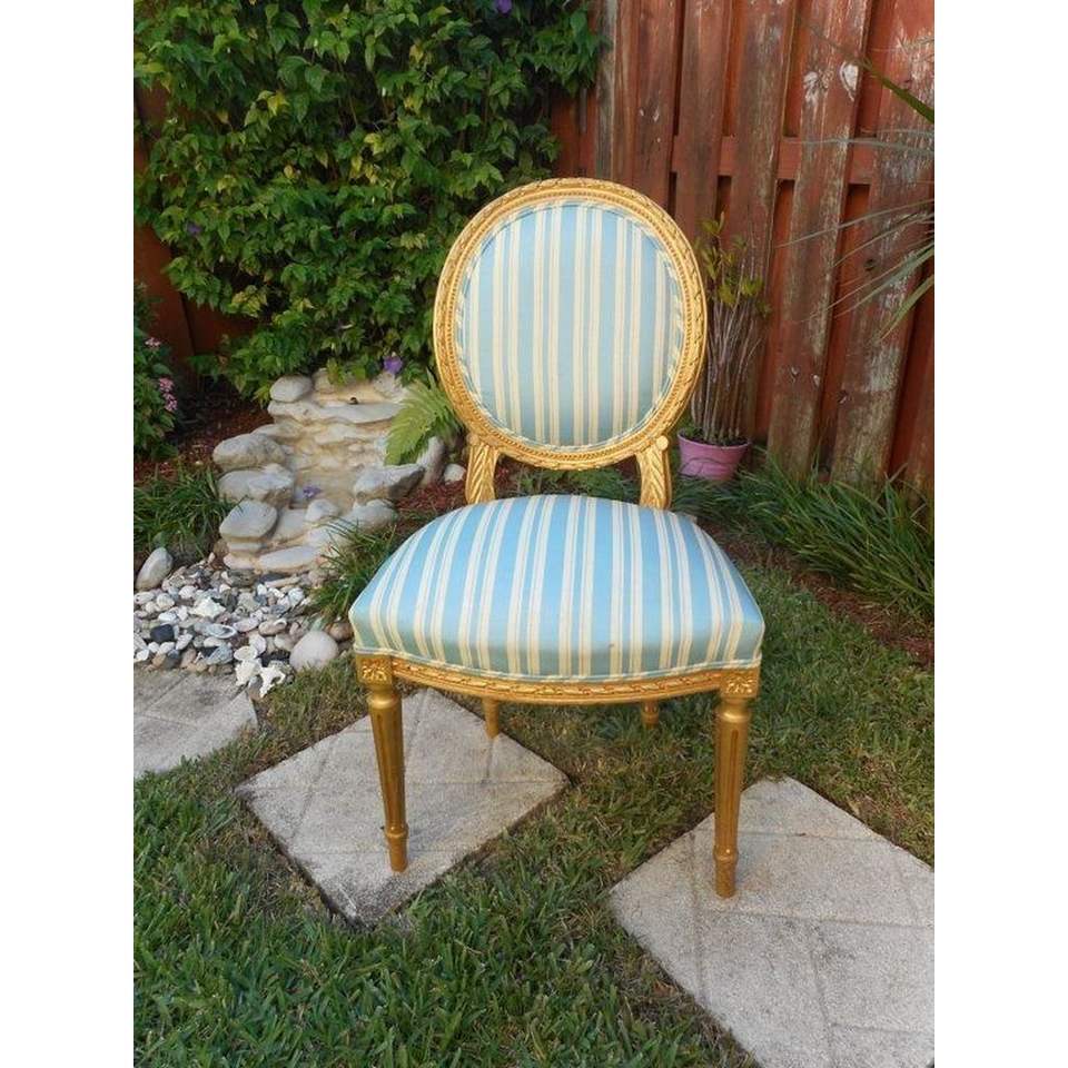 Description:Vintage Dining Chair Gold Frame Blue and White Striped Seat
