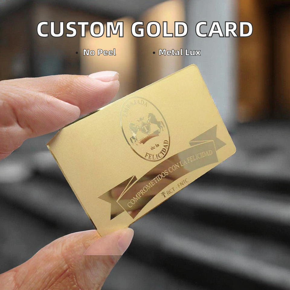 Carte de visite personnalisée CLF haut de gamme en acier inoxydable doré effet miroir, impression numérique concave, pelliculage résistant à l'effilage