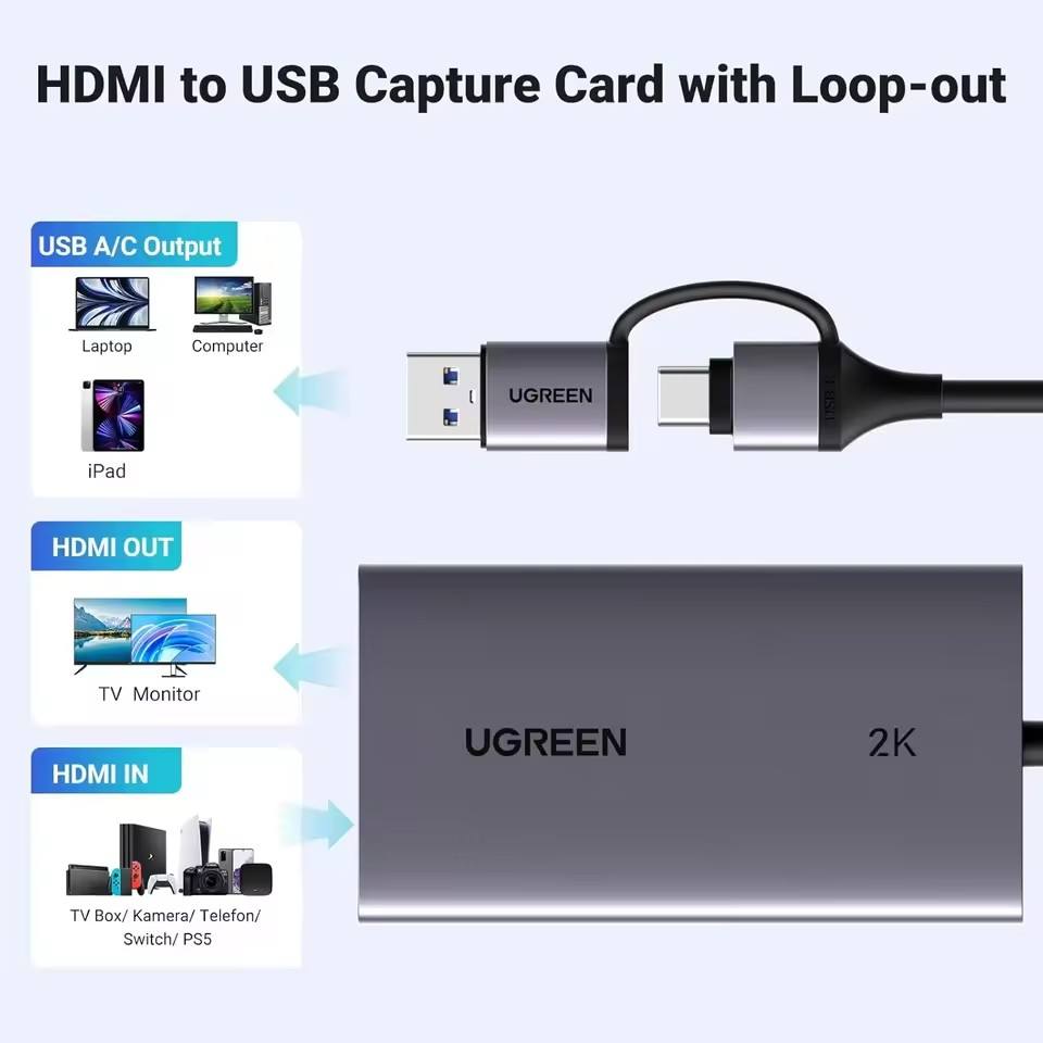 Carte de capture HDMI UGREEN CM726 2K 30 ips avec sortie en boucle 4K, convertisseur vidéo HDMI vers USB Type-C pour enregistrement et diffusion en direct sur ordinateur