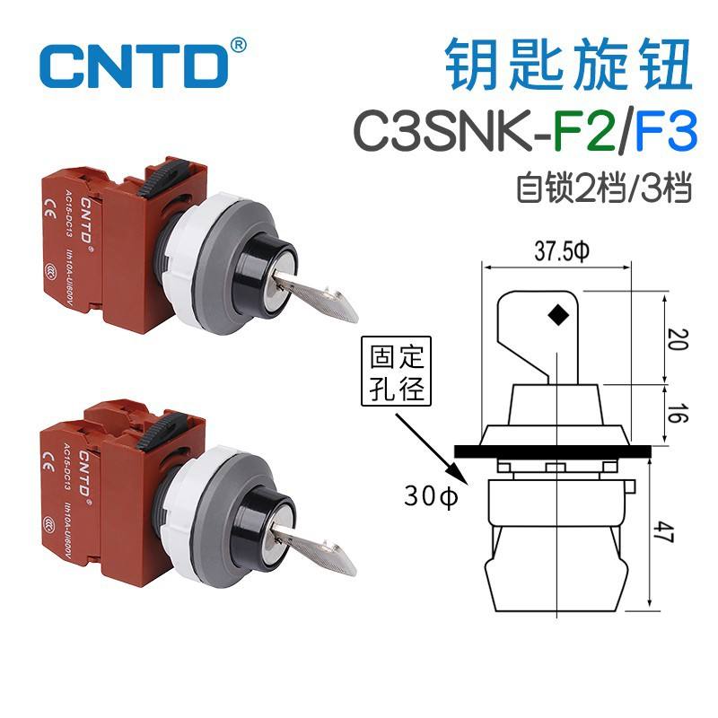 Interrupteur à bouton-poussoir CNTD Changde C3SNK-F2/F3, autobloquant, bouton à clé, momentané, plastique, 12 mm, deuxième et troisième position, ouverture 30
