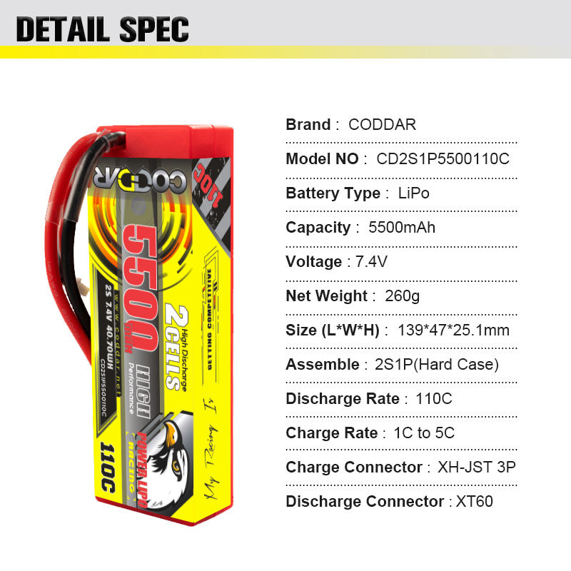 CODDAR 2S 5500MAH 7.4V 110C 220C XT60 avec boîtier rigide câblé RC batterie LiPo échelle 1/10 RC voiture bateau de course Tamiya sauterelle