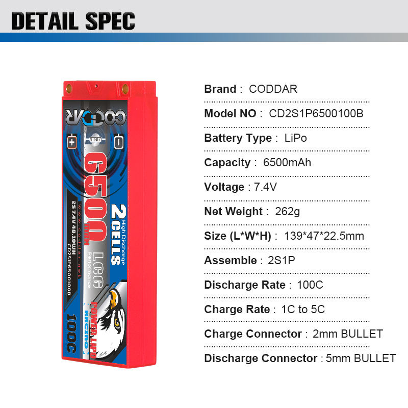 CODDAR 2S 6500MAH 7.4V 100C 200C 5mm balle 22.5mm épaisseur LCG boîtier rigide RC LiPo batterie 1/10 RC voiture bateau Tamiya sauterelle