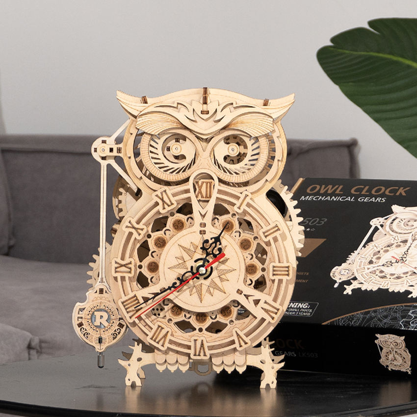 Jouets assemblés à la main certifiés CPC Robotime US Warehouse DIY LK503 Horloge hibou Puzzle en bois 3D