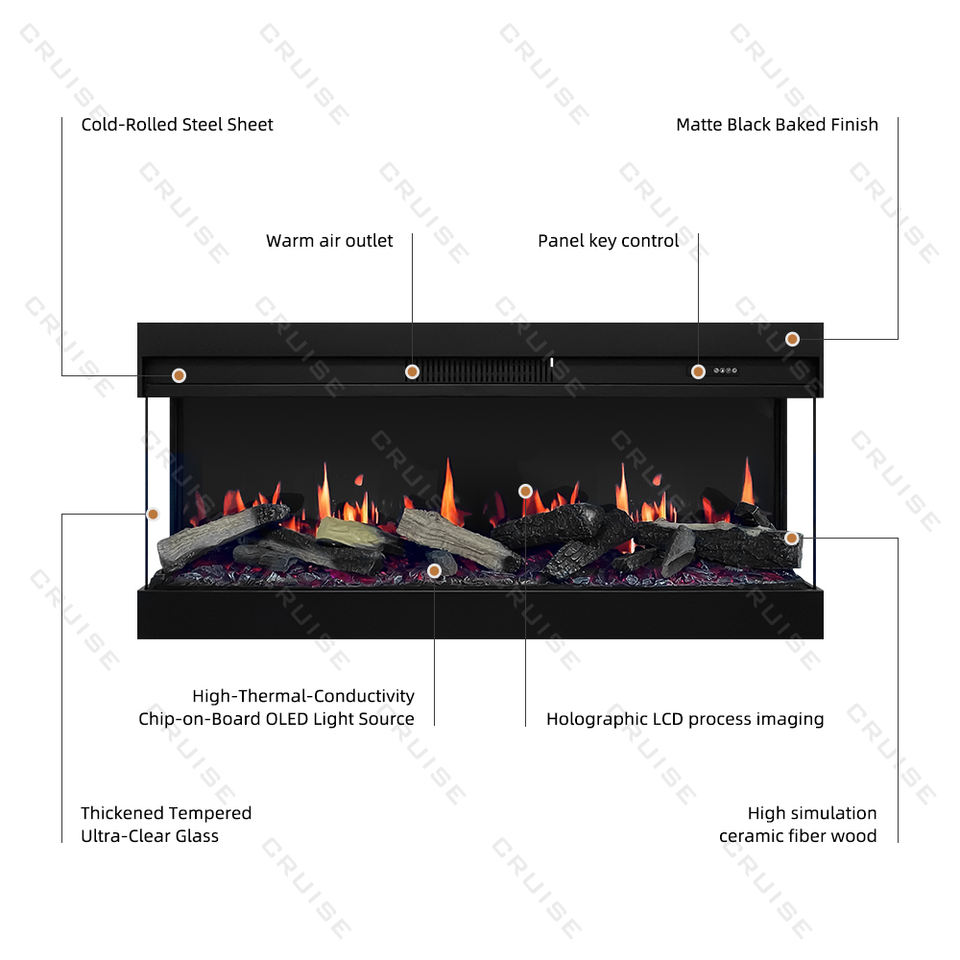 CRUISE Cheminée électrique modulaire holographique LCD 640 mm avec son et image de bois brûlant intégrés, insert 3 faces