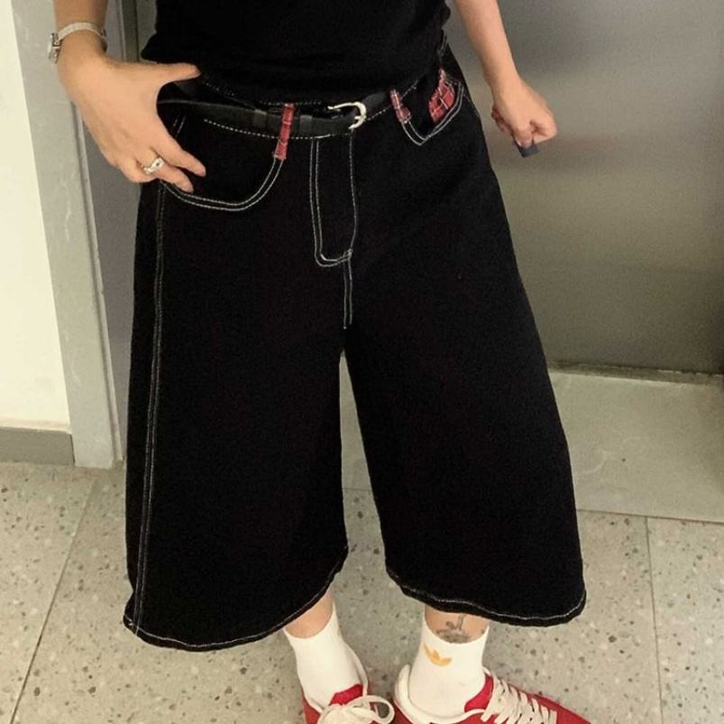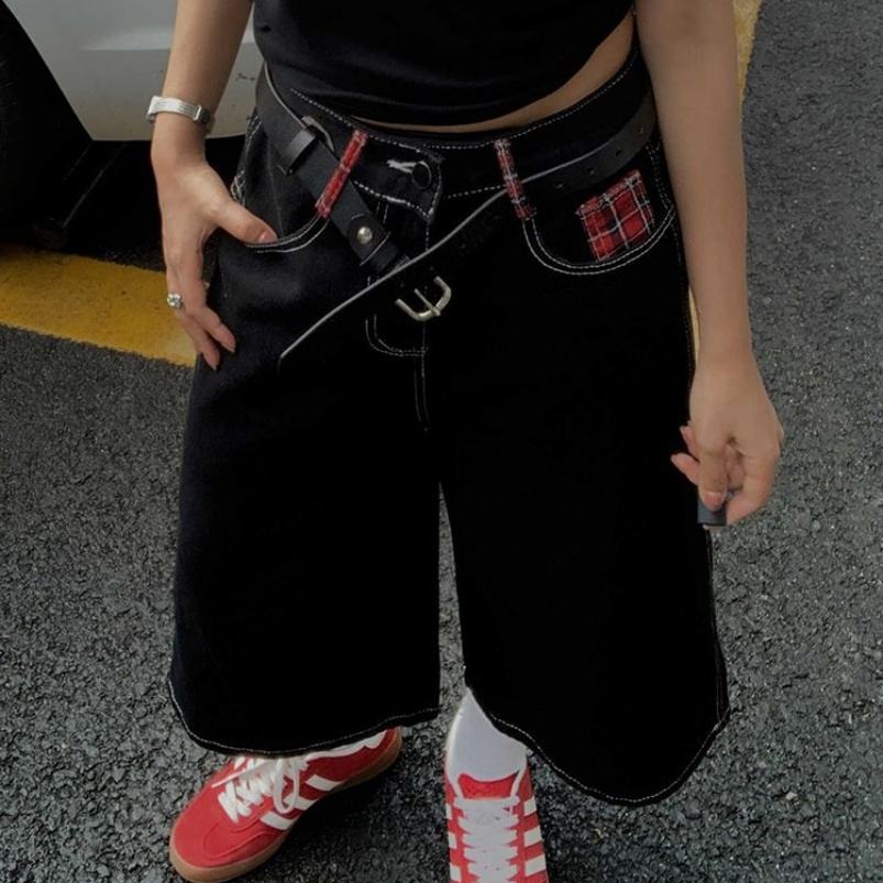 Viviblook Z612PT01 Casual High Street Red Plaid Denim Cropped Pants for Women's Summer New Loose Straight Wide Leg Mid Pants