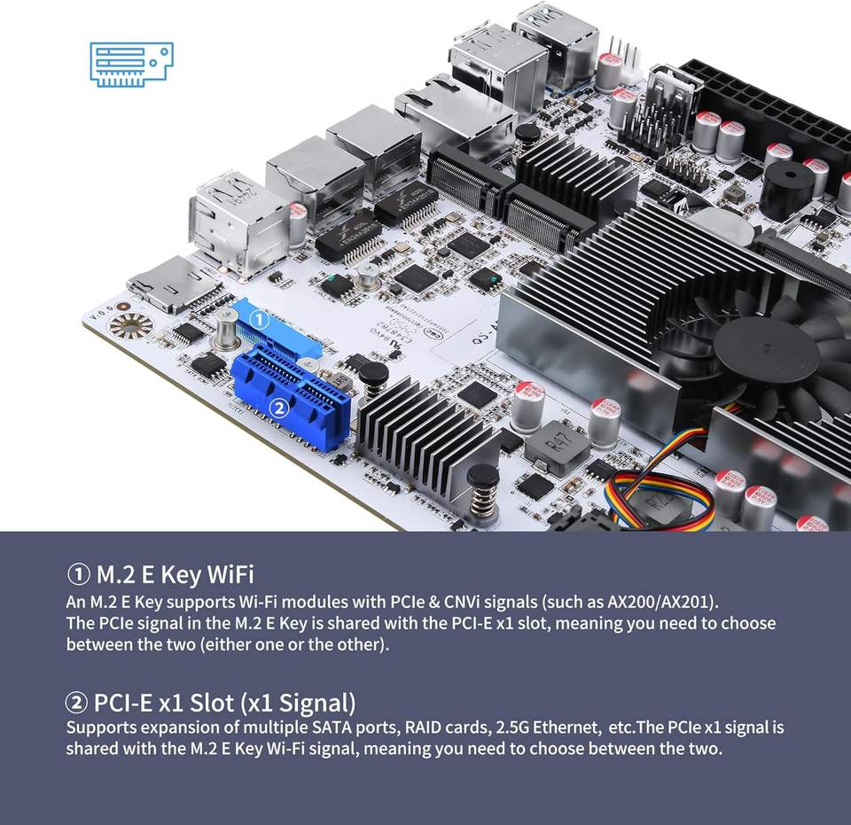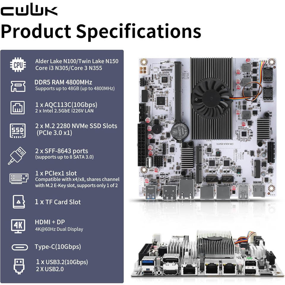 Carte mère PC Mini ITX CWWK N150 CPU blanche M8 double LAN 2.5GbE DDR5 2x NVMe M.2 WiFi USB-C 8 baies avec 10GbE RJ45 NAS