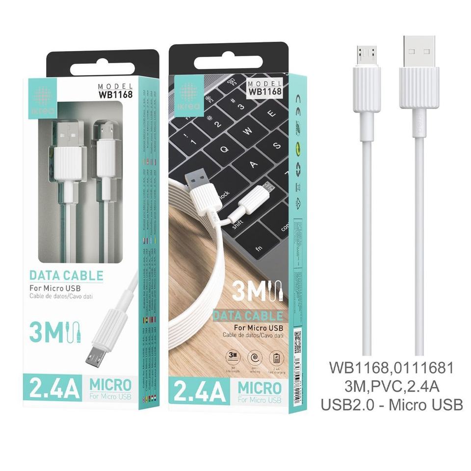 Câble micro USB 3m 2.4A Blanco