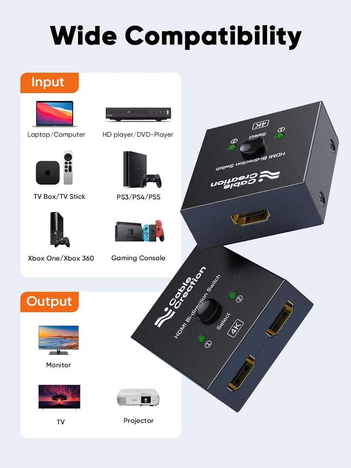 Répartiteur HDMI CableCreation 2 en 1 sortie 4K @ 60Hz Commutateur HDMI Boîtier métallique Commutateur HDMI bidirectionnel