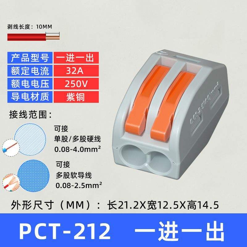 Bloc de bornes à ressort 2 pôles Cablecon PCT-212, connecteur de câblage orange à enfoncement pour l'électronique et l'ingénierie électrique