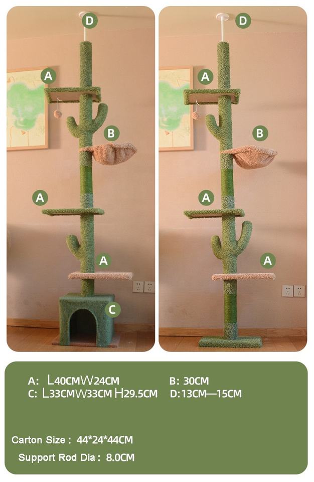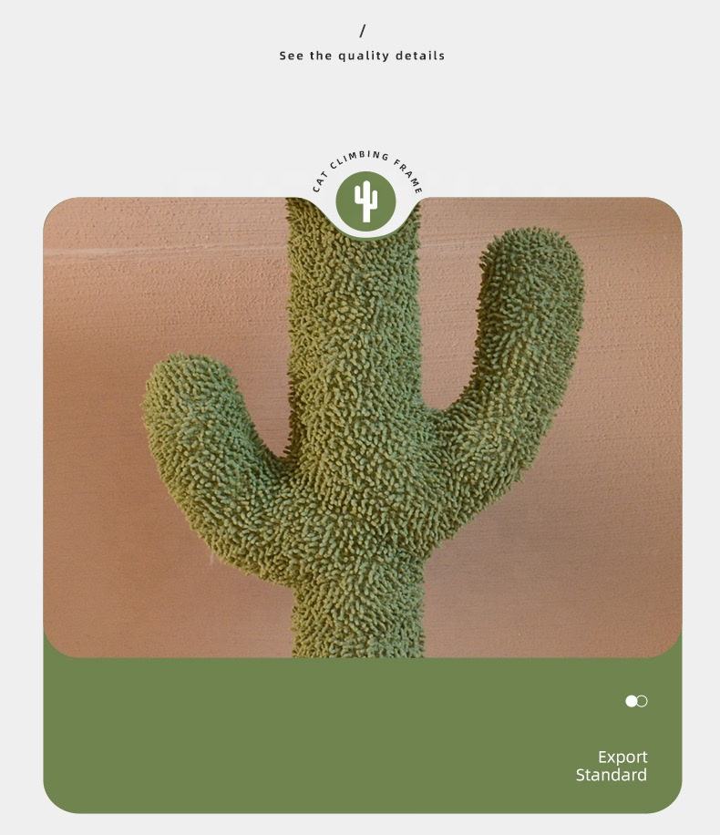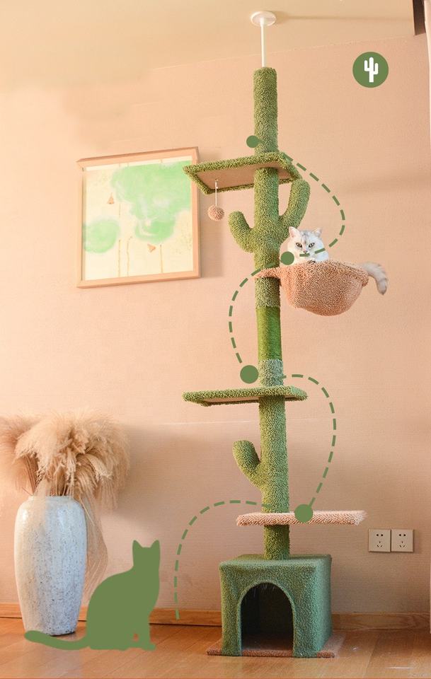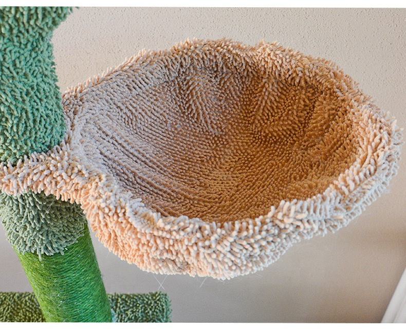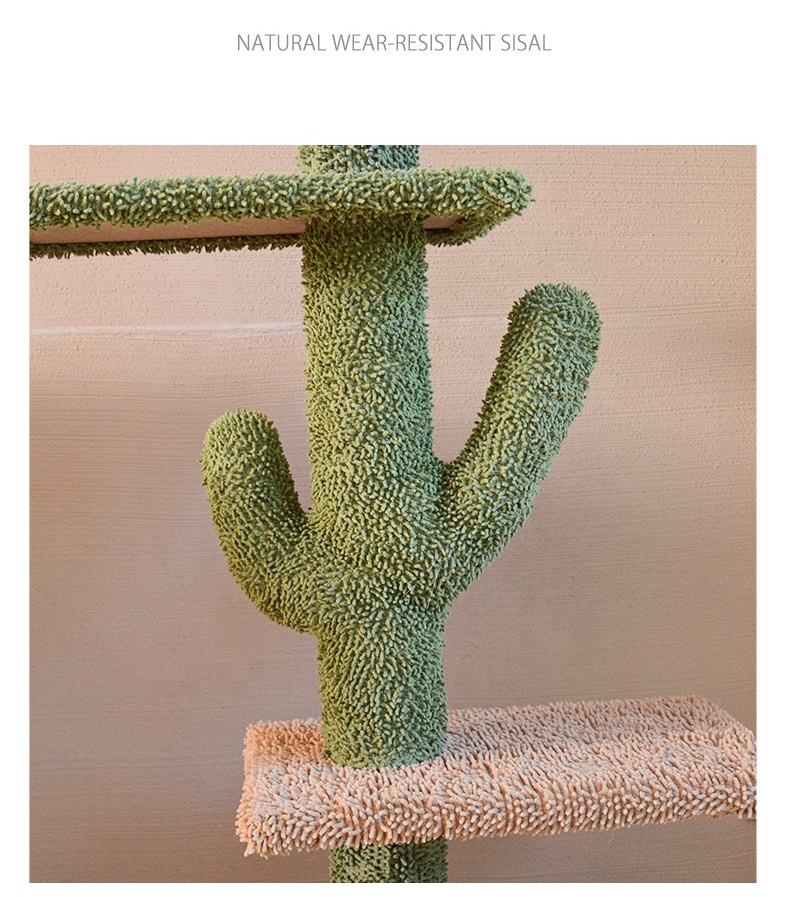 Arbre à chat sur le thème du cactus avec lit cube et poteau céleste - Panneau E1, tissu chenille, corde colorée de 4 mm, centre de jeu et de sommeil moderne