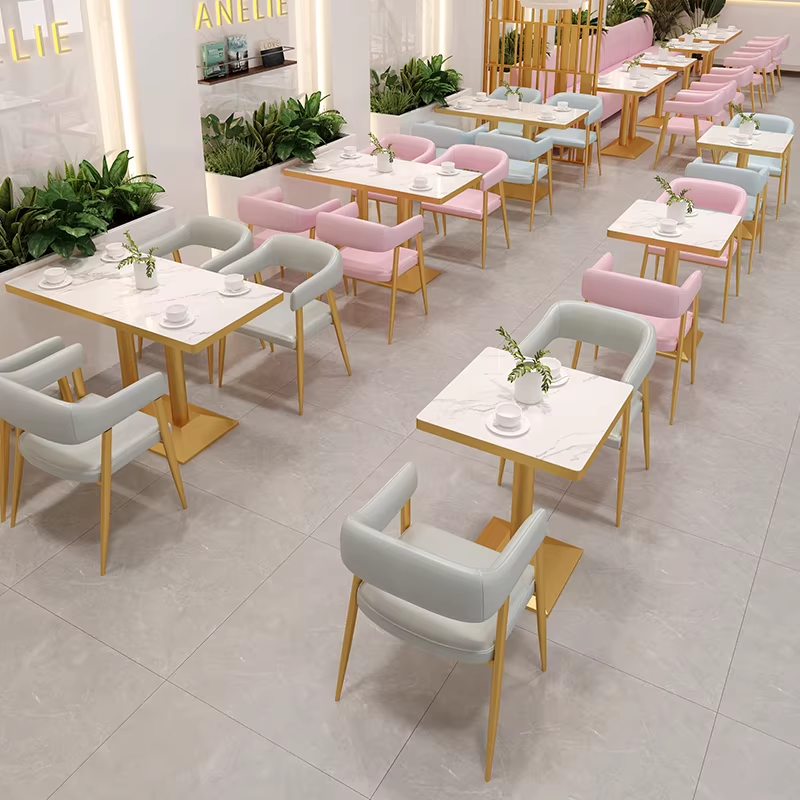 Ensemble de table et de chaises de restaurant en bois, mousse haute densité, durable, rose, pour boutique de gâteaux, mobilier commercial, table à manger, stand, lait, bubble tea