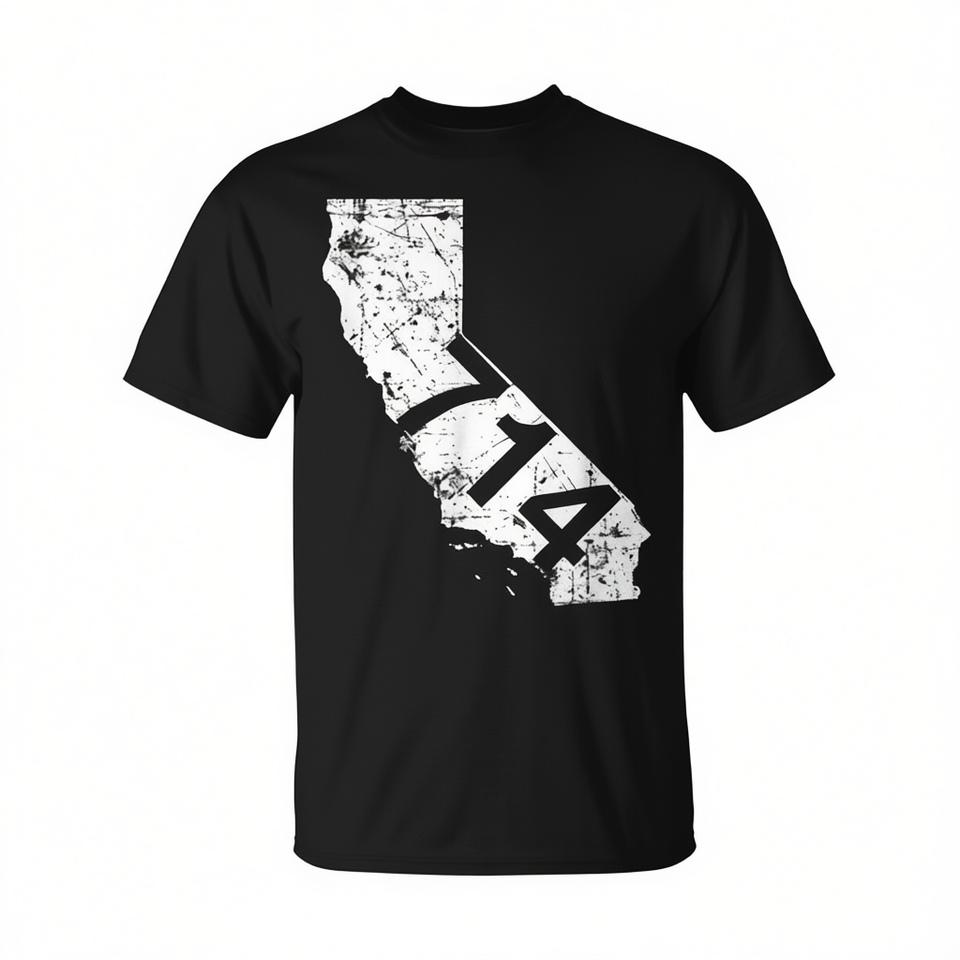 T-shirt noir unisexe à col rond et manches courtes avec design promotionnel du code postal 714 de Californie
