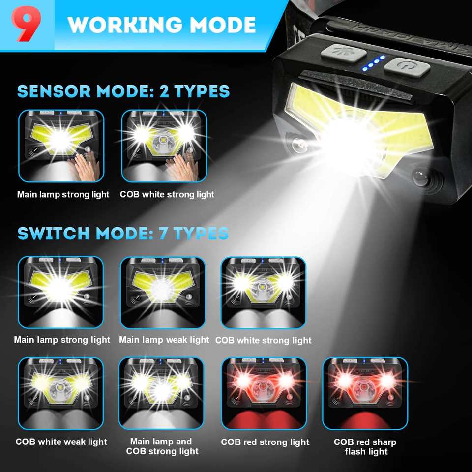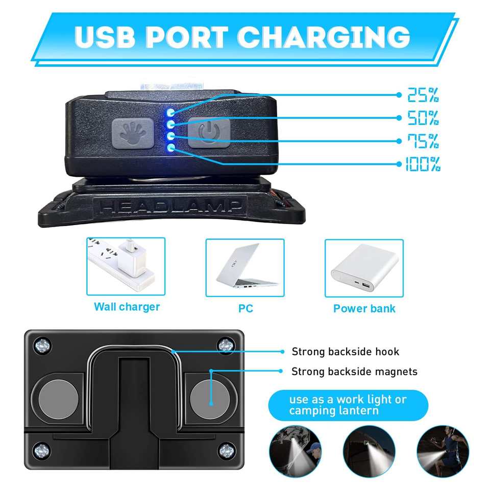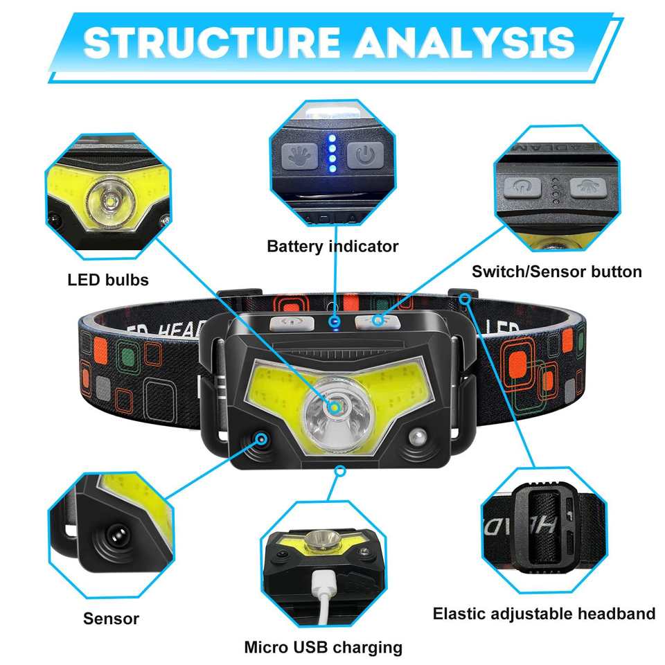 Capteur de mouvement de camping Toutes les perspectives Lampe frontale à induction Lampe frontale magnétique Linterna Frontal Cabeza Led Lampe frontale rechargeable