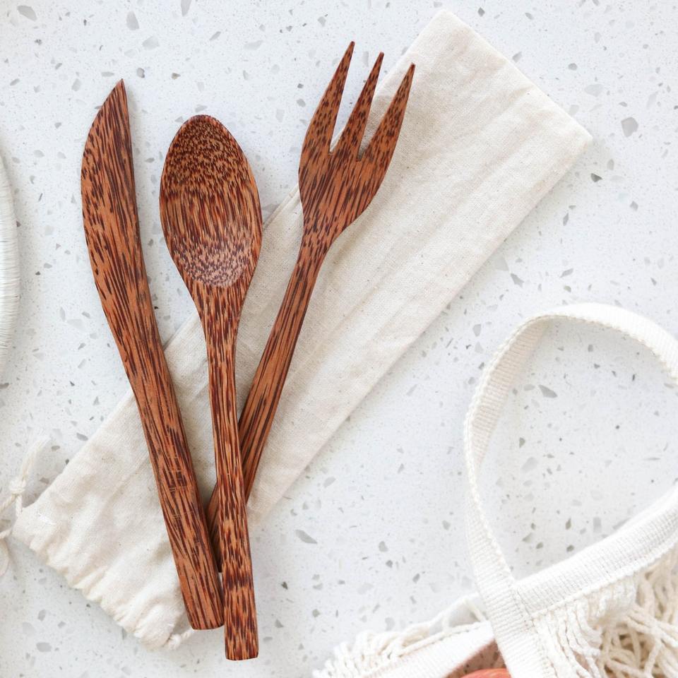 Camping cutlery bag wholesale price coco wood utensil natural coconut flatware for outdoor dining