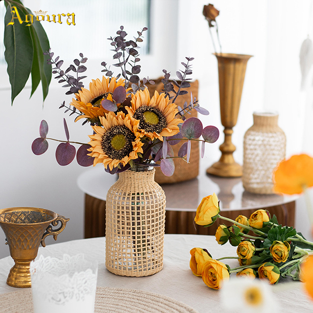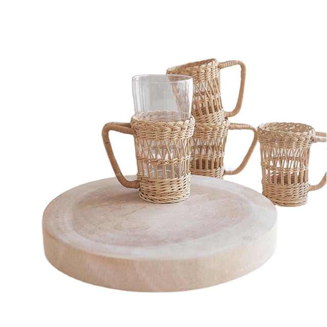 Ensemble de tasses en rotin artisanal en canne indonésienne et herbe jaune, personnalisable et créatif