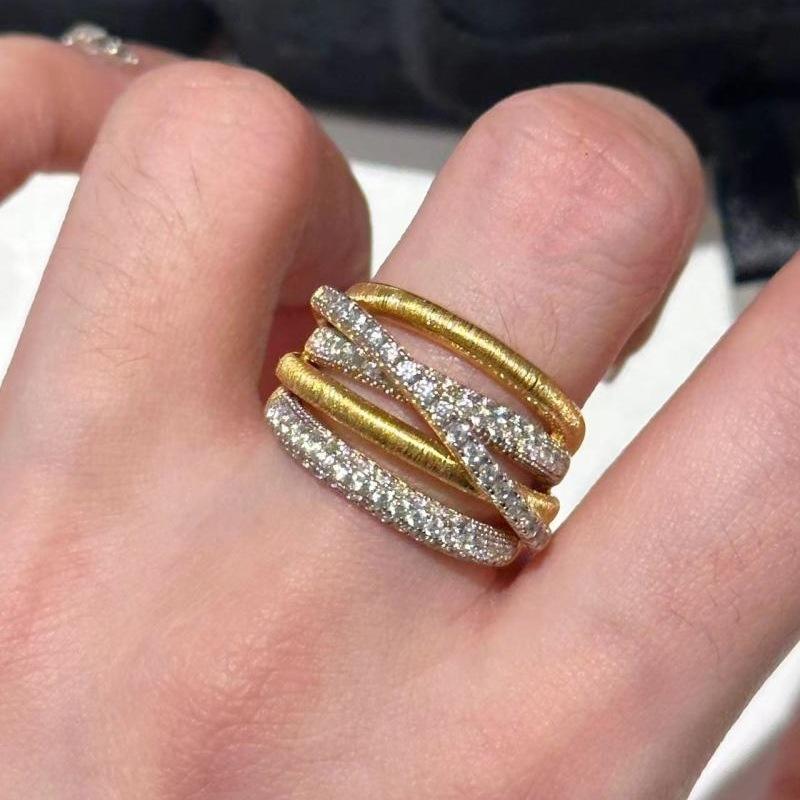 Canary Italian S925 Pure Silver Plated 18K Gold Brushed Multi-Layer Diamond Cross Ring Fashionable and Trendy Inlay Setting