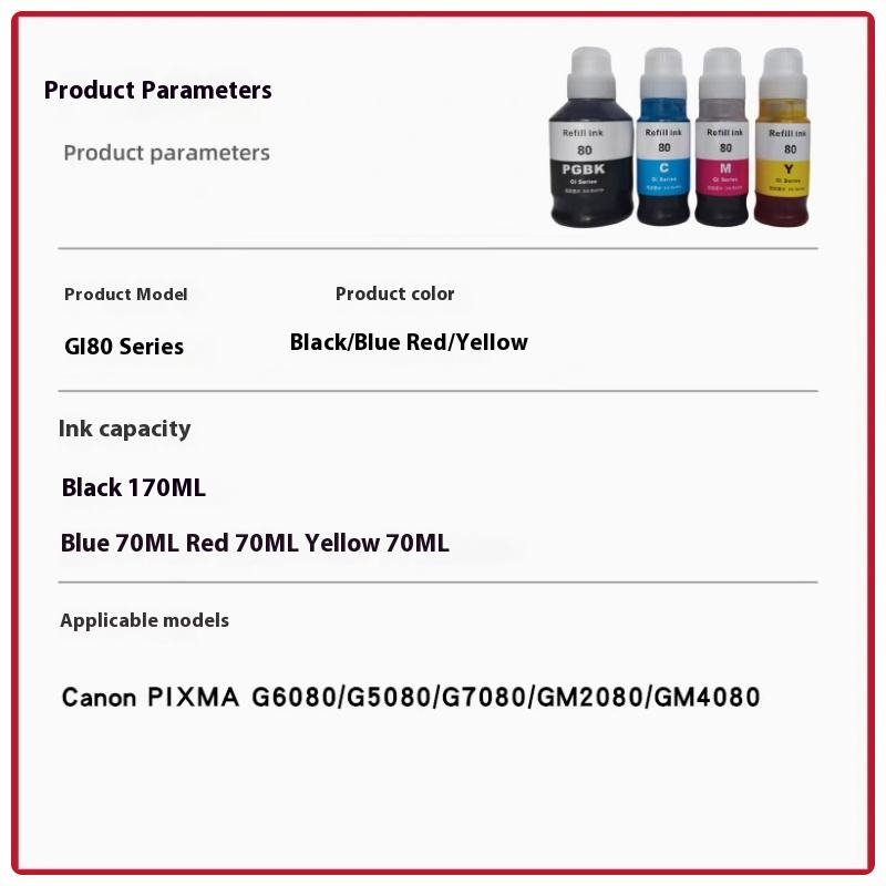 Bouteille de remplissage d'encre Canon pour 80 GI20 GI30 GI40 GI50 GI60 GI70 GI80 GI90 G5020 G6030 G5040 G6050 G6060 GM2070 G6080 G6091