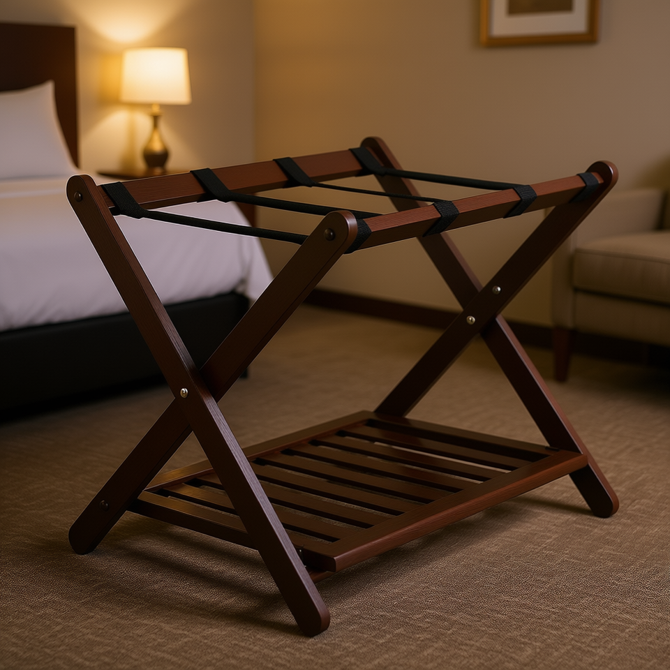 Porte-bagages Cappuccino Remy avec étagère, en bois, pliable, mobilier d'hôtel, design contemporain