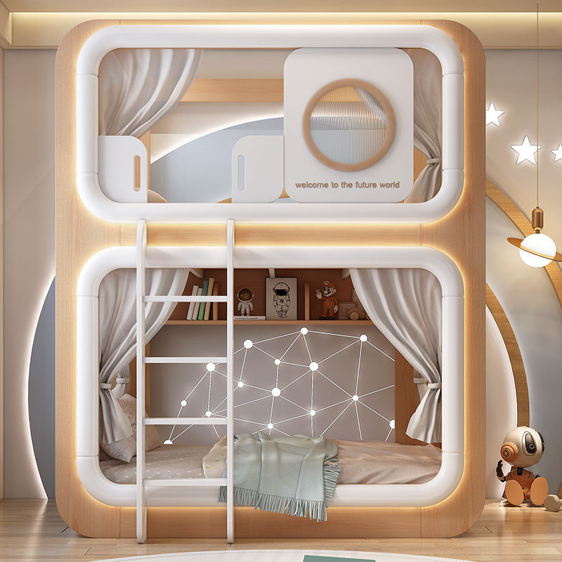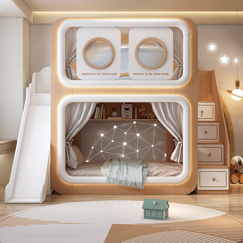 Lit superposé pour enfants en capsule, style loft moderne, MDF E1, confortable, adapté aux adultes, taille double, avec glissière, lit de rangement