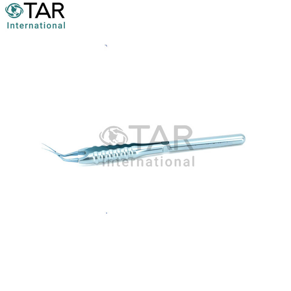 Pinces à capsulorhexis à pointe acérée dentelée, embouts entrecroisés, tige angulaire à 45 degrés, instruments chirurgicaux ophtalmiques, chirurgie oculaire