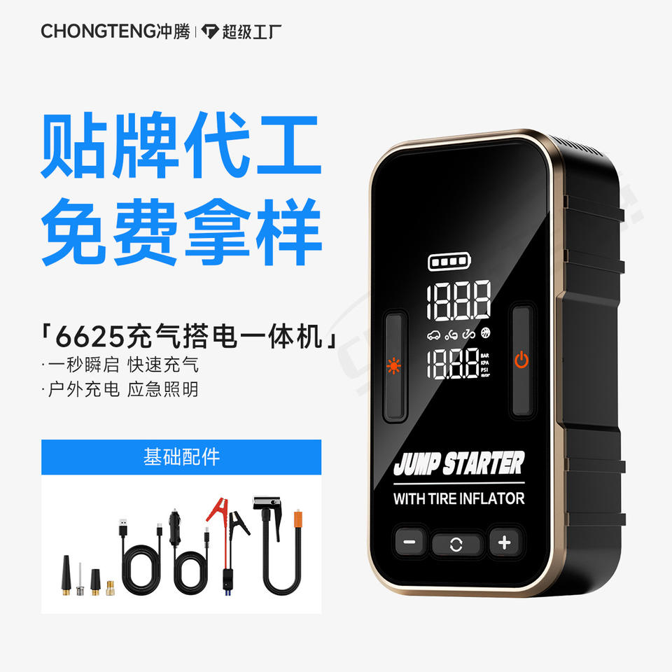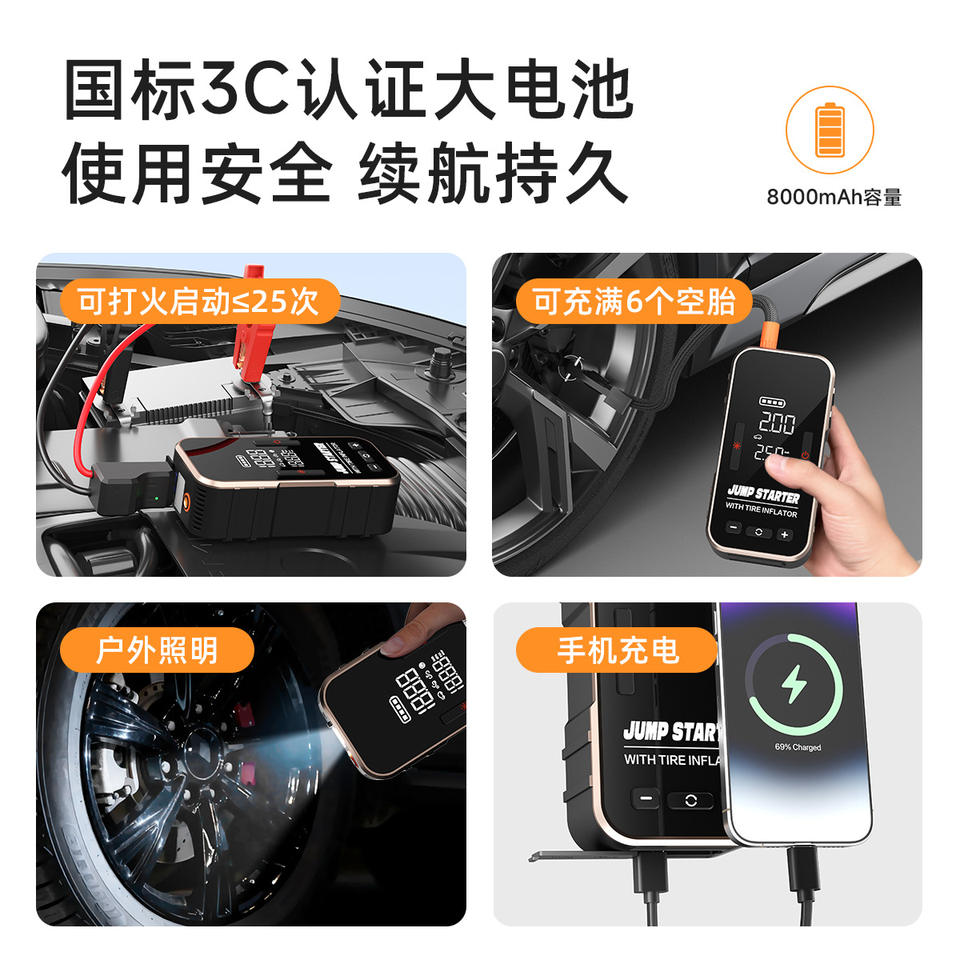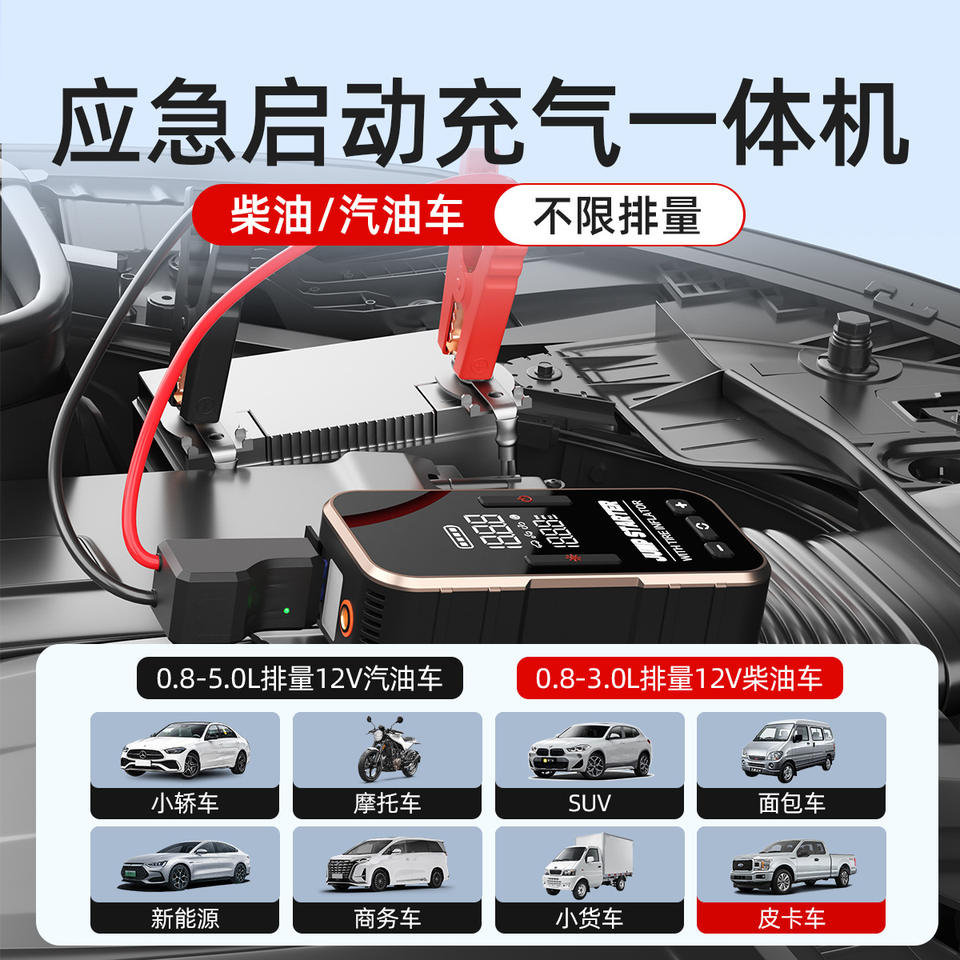 Démarreur de secours pour voiture avec gonfleur de pneus, écran numérique 12V, courant de crête 300A, cylindre de 22 mm
