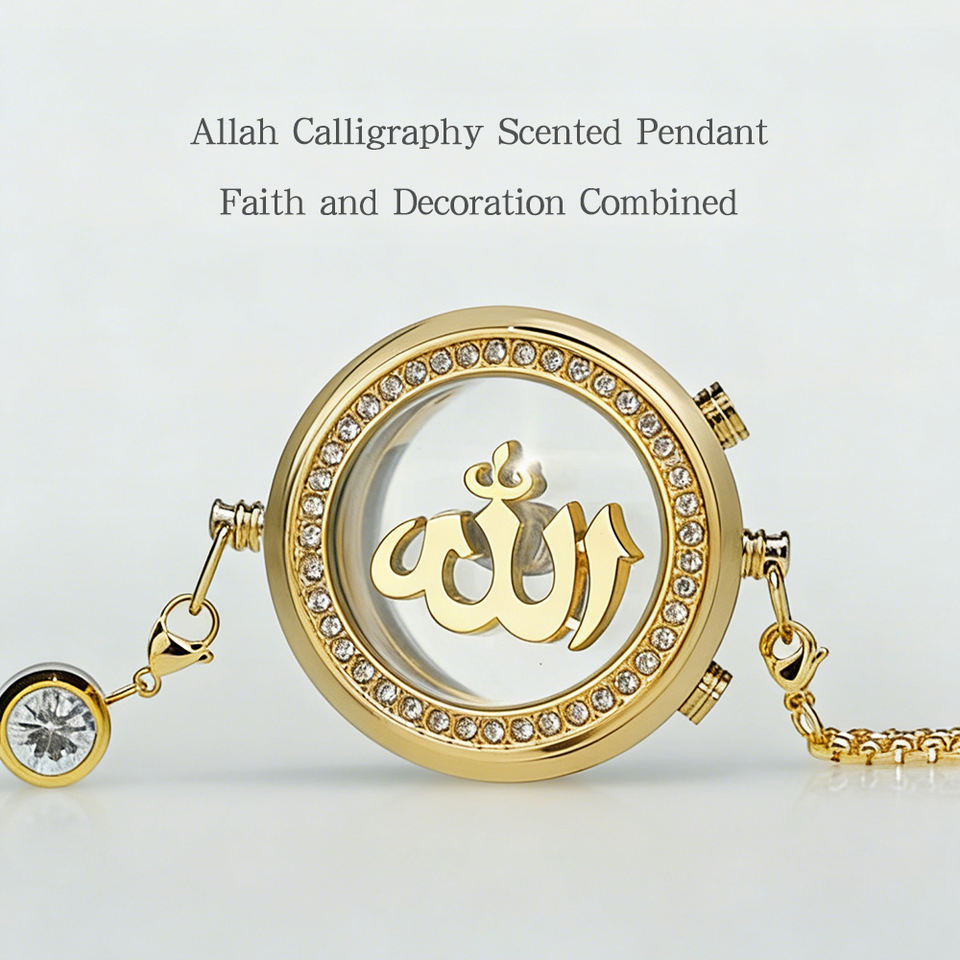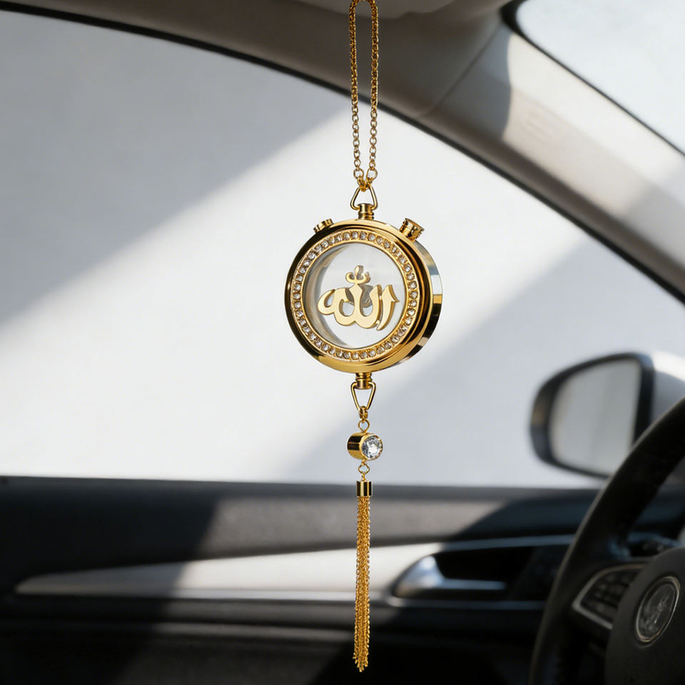 Ornement de voiture à suspendre avec chaîne, Allah Muhammad, pendentif rond en métal avec strass, calligraphie arabe, cadeau musulman pour l'Aïd et le Ramadan