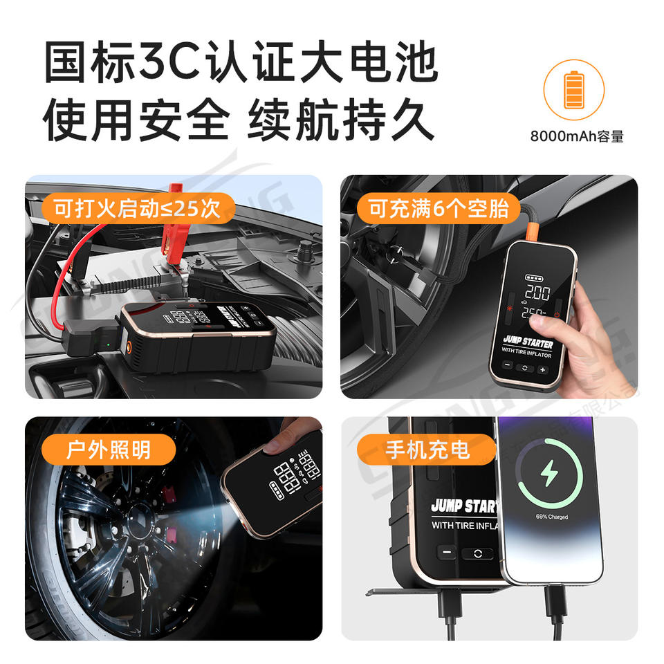 Démarreur de voiture avec gonfleur de pneus 12V, écran numérique, courant de crête 300A, débit d'air minimum 25L/min, cordon de 3m