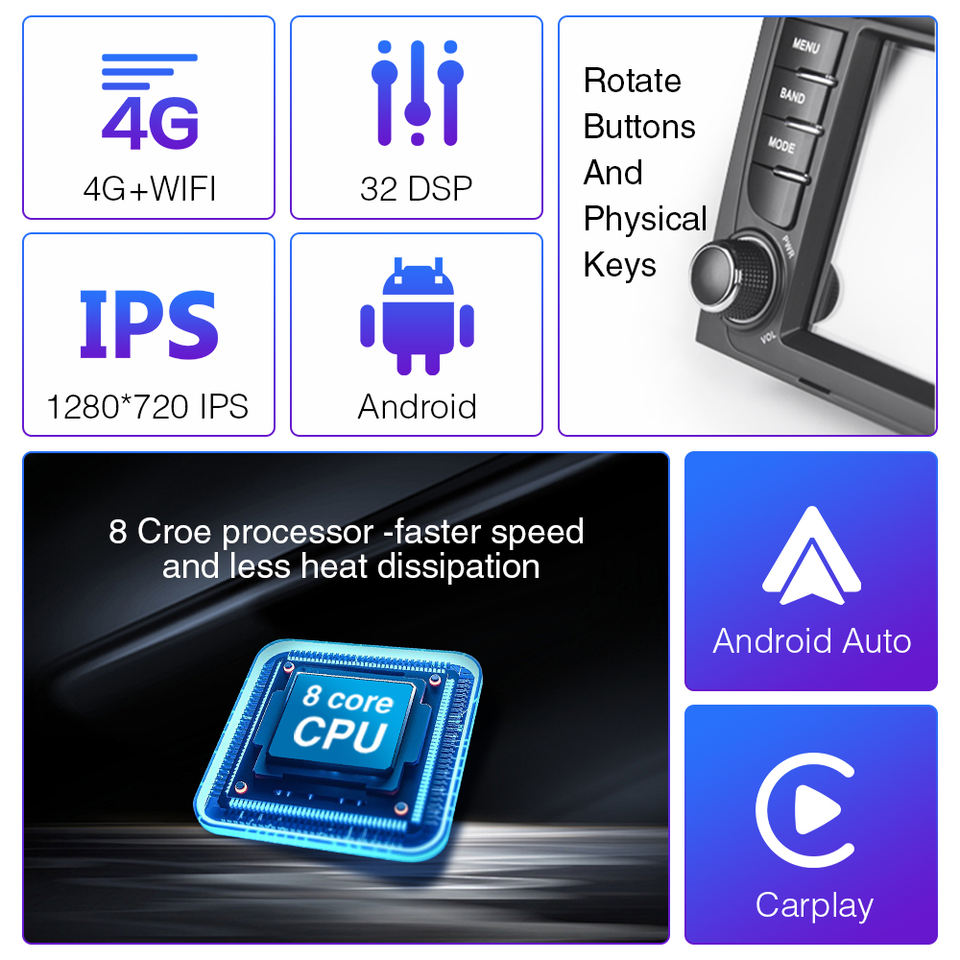 GPS, DSP, CarPlay, Lien de miroir, Android auto, Microphone intégré, Écran partagé, Gestionnaire de fichiers, Volant de voiture de Contrôle, Haut-parleur intégréFonction