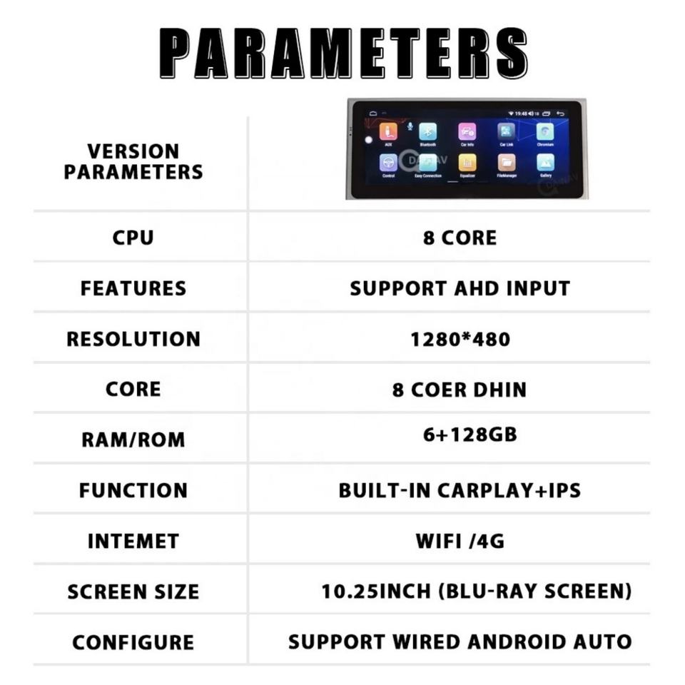 CarPlay, Android auto, Bluetooth-activé, Intégré DSP, MP3/MP4, Écran tactile, Visionneuse photo, Radio Tuner, Télécommande, Guidage vocal, Commande au Volant, Écran partagé, Aide à l'inversion, Multimédia Soutenu, Microphone Intégré, Téléchargement de l'application depuis le Play StoreFonction