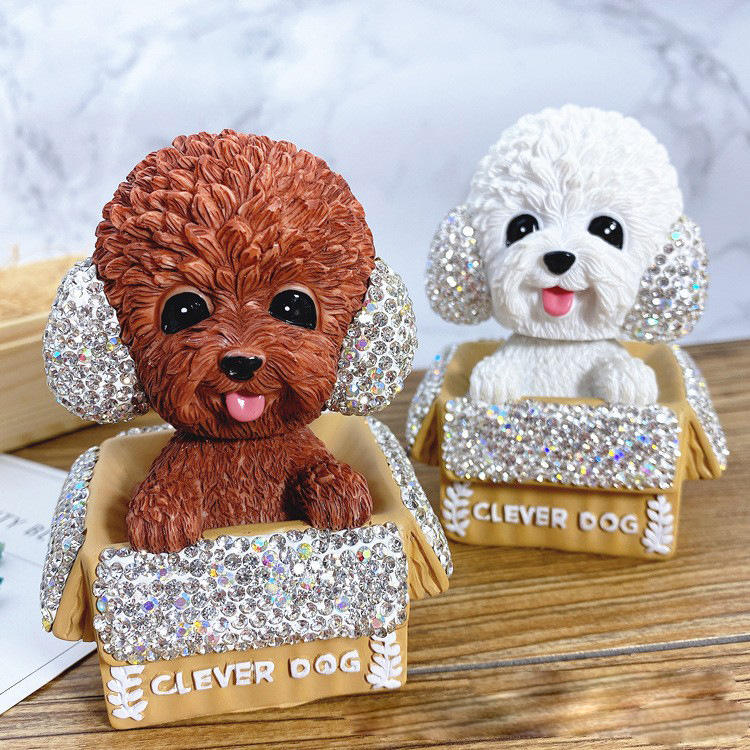 Ornement de voiture créatif en carton, chien en peluche incrusté de diamants, décoration de voiture, poupée à tête oscillante