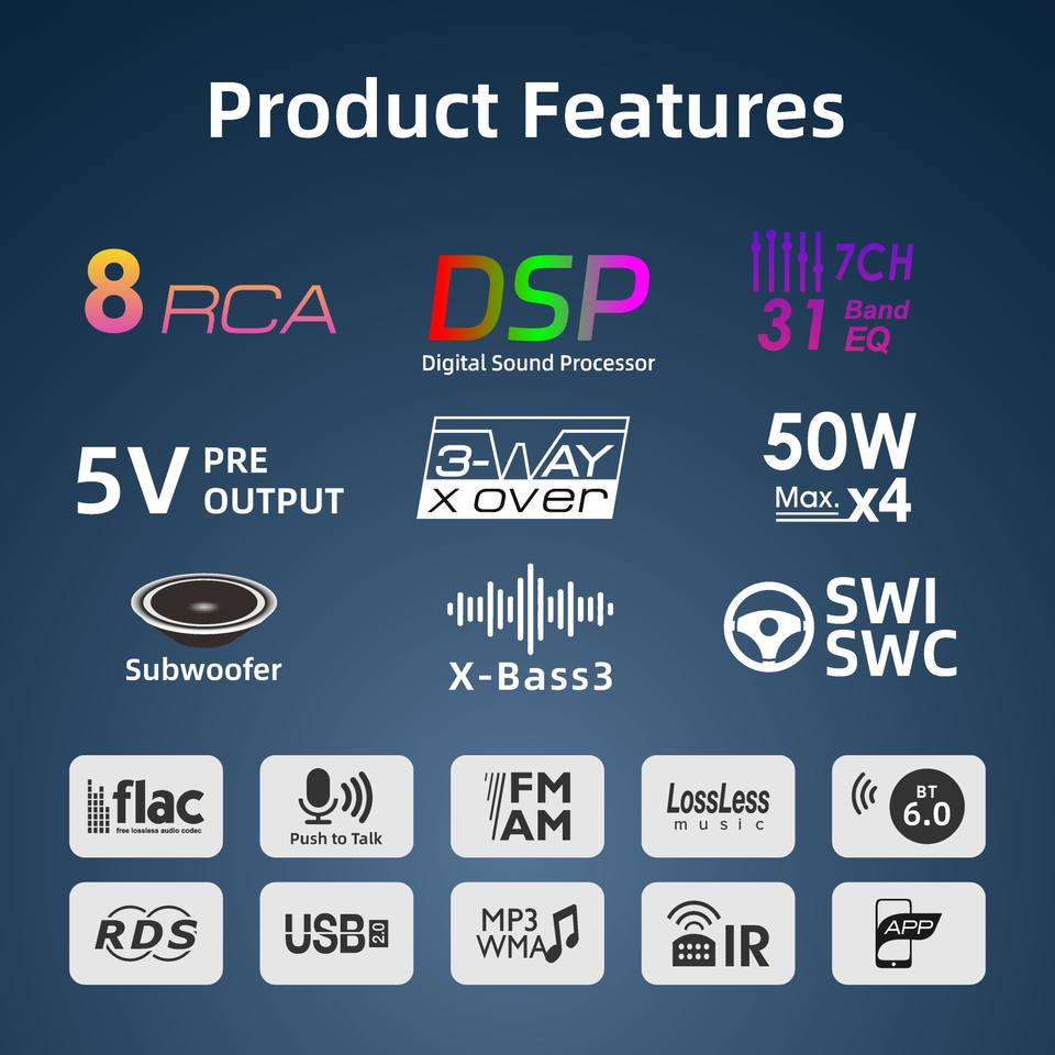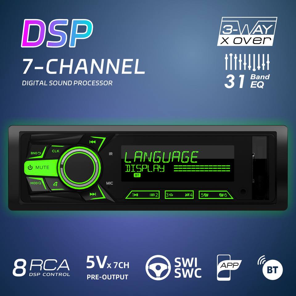 Autoradio 3 Zones RBG 1DIN DSP MP3 Bluetooth 6.0 Mains Libres RDS FM AM 8 RCA 7 Canaux Égaliseur 31 Bandes 5V RCA OEM Usine