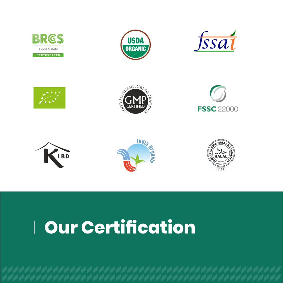 Certificate:FSSC 22000/BRCGS/GMP/FSSAI/ISO 22000/Kosher/Halal