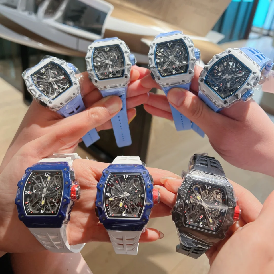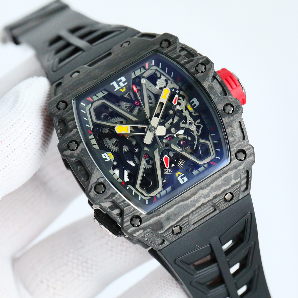 Montre mécanique à tourbillon intégré avec boîtier en forme de barillet en fibre de carbone, bracelet en caoutchouc et fond transparent.