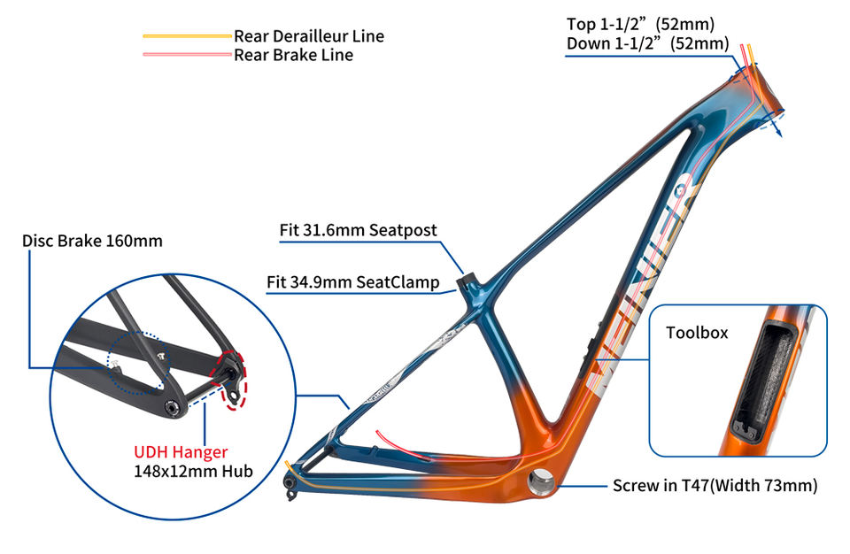 Cadre vtt en fibre de carbone Snake Max avec boîte à outils câble caché complet XC VTT cadre usines à vendre cadre vtt rigide