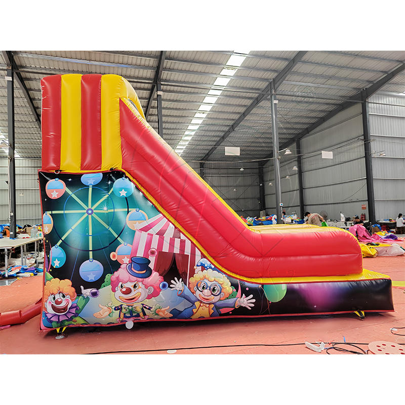 Toboggan gonflable de carnaval avec des graphismes de clown colorés et un design à rayures rouges et jaunes pour les centres de divertissement familial en intérieur