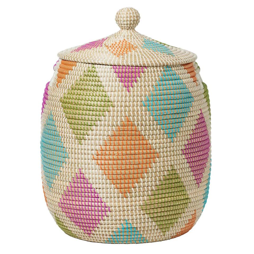 Nom:Boîte colorée en jonc de mer Caro. Dimensions : D17,8 x H24 pouces.