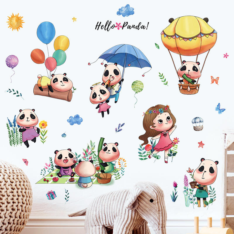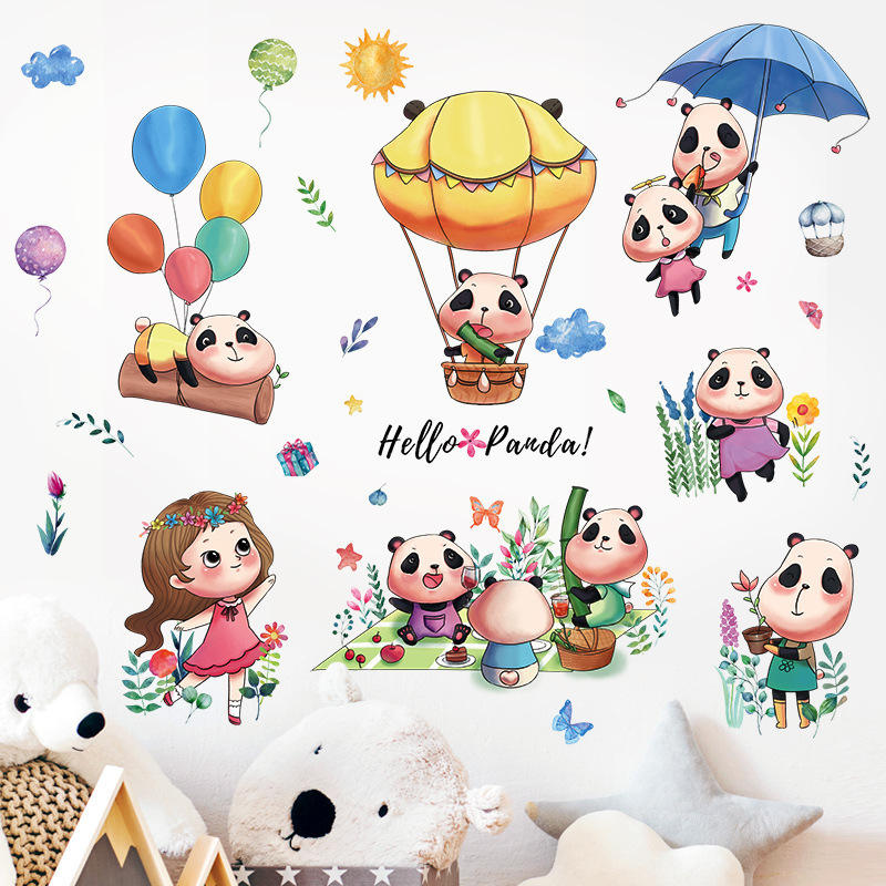 Dessin animé Animal Panda soleil et petites filles autocollant mural pour chambre maternelle salle de classe chambre d'enfants sticker mural décor à la maison