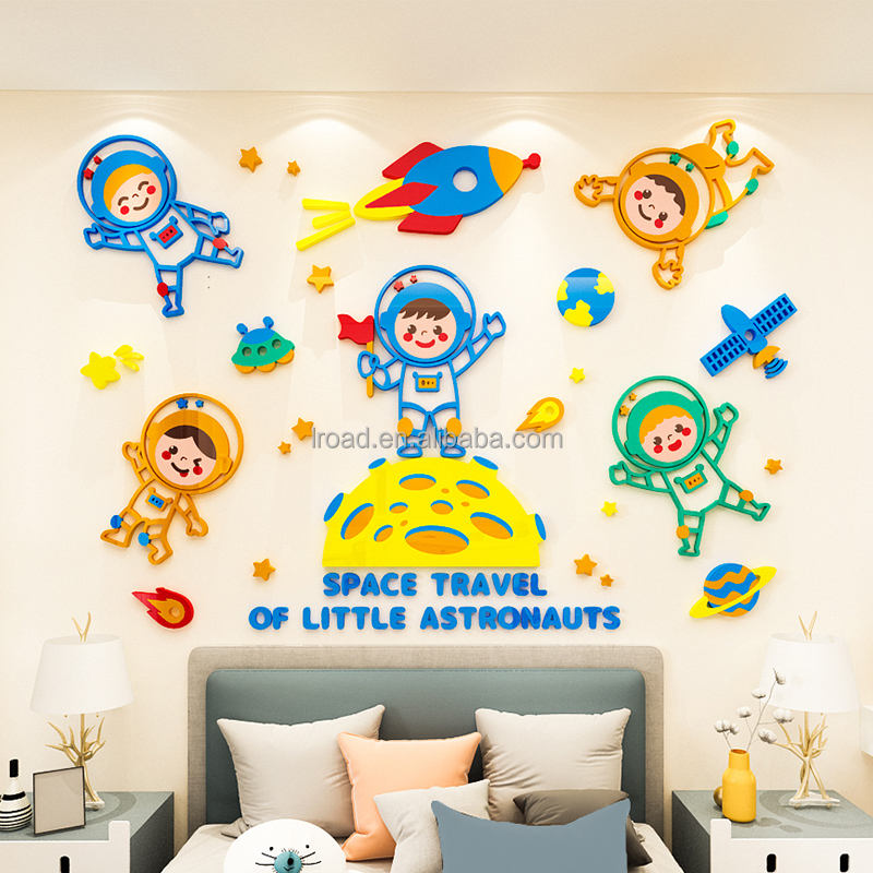 Autocollant mural décoratif d'astronaute de dessin animé, vaisseau spatial, bricolage, art acrylique, autocollant mural pour chambre de garçon, salle de jeu, décoration murale
