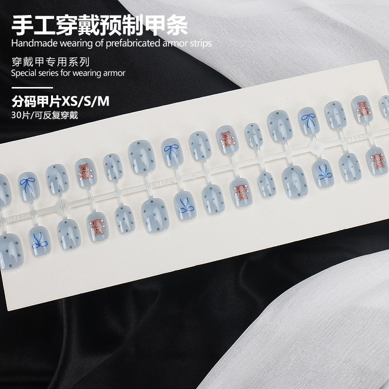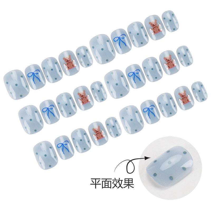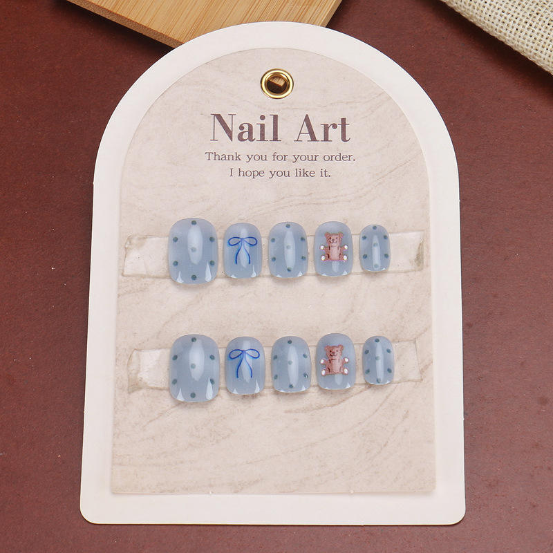 Dessin animé ours portable ongles Style court frais bleu clair à pois nœud papillon UV Gel autocollants doux Nail Art pièces