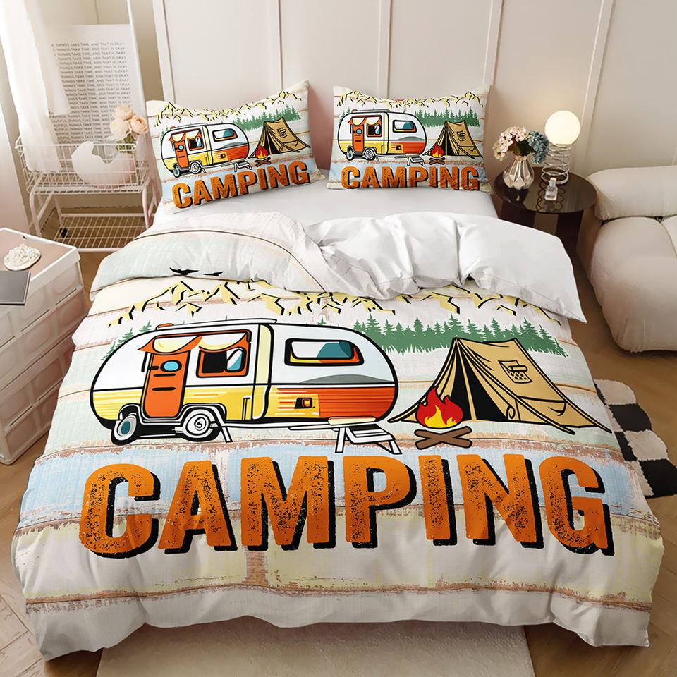 Housse de couette d'hiver en tissu microfibre imprimée en 3D avec motif de camping-car de dessin animé, ensemble de trois pièces, utilisation domestique