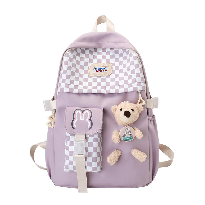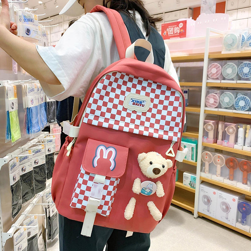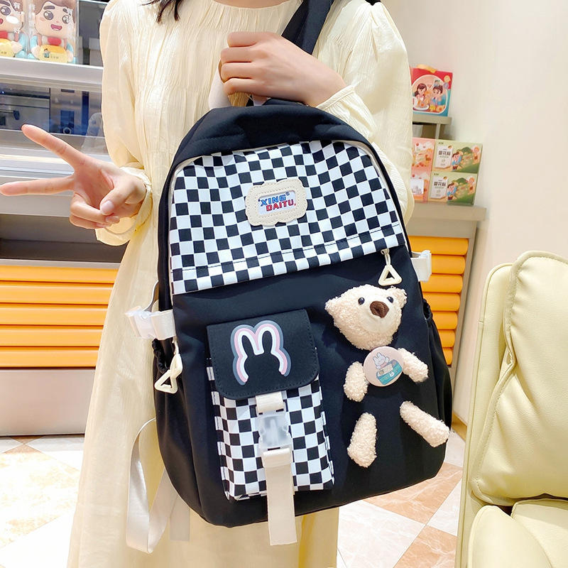 Sac à dos pour filles de style japonais, motif damier de dessin animé, haute esthétique, ensemble de quatre pièces
