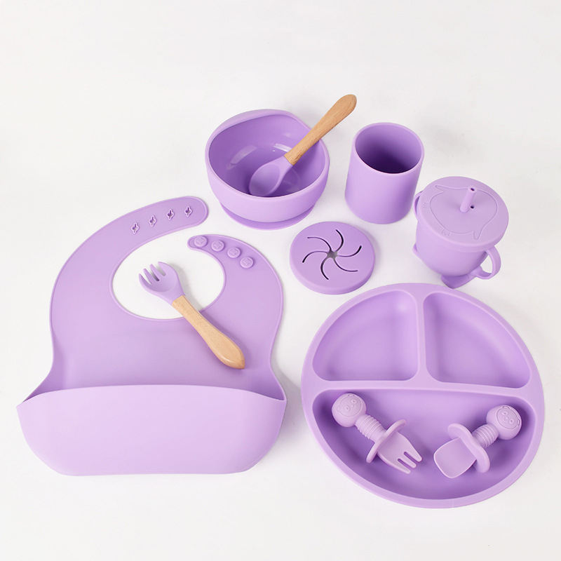 Cartoon Design Baby Food Grade Silicone Tableware Set of Ten Printing Point Baby Complementary Feeding Plate Suit