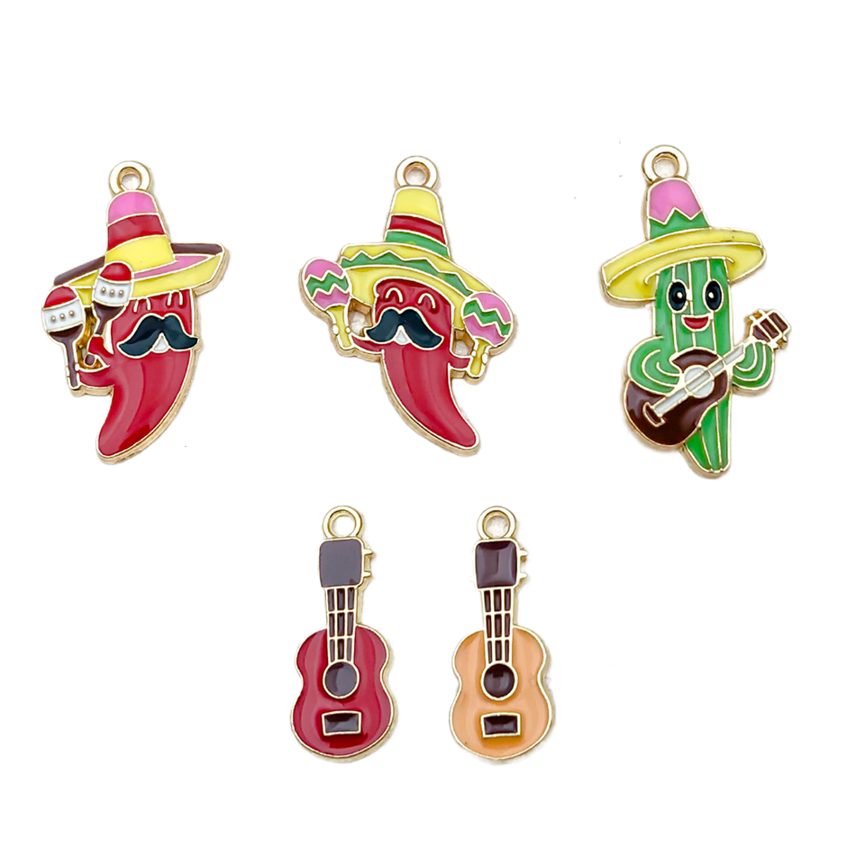 Porte-clés en alliage de zinc DIY, série de musique de guitare, motif cactus piment mexicain de dessin animé, avec goutte d'huile, petit instrument de musique