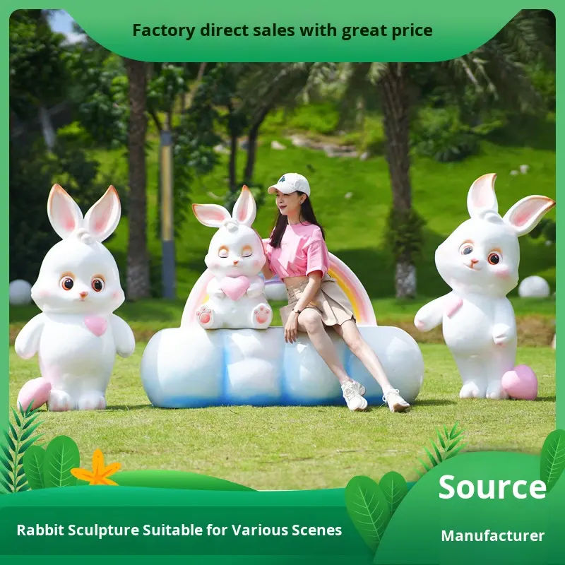 Sculpture en fibre de verre en relief, motif lapin de dessin animé et nuage arc-en-ciel, ornement animal, modèle d'extérieur, décoration de paysage, fabriqué en Chine